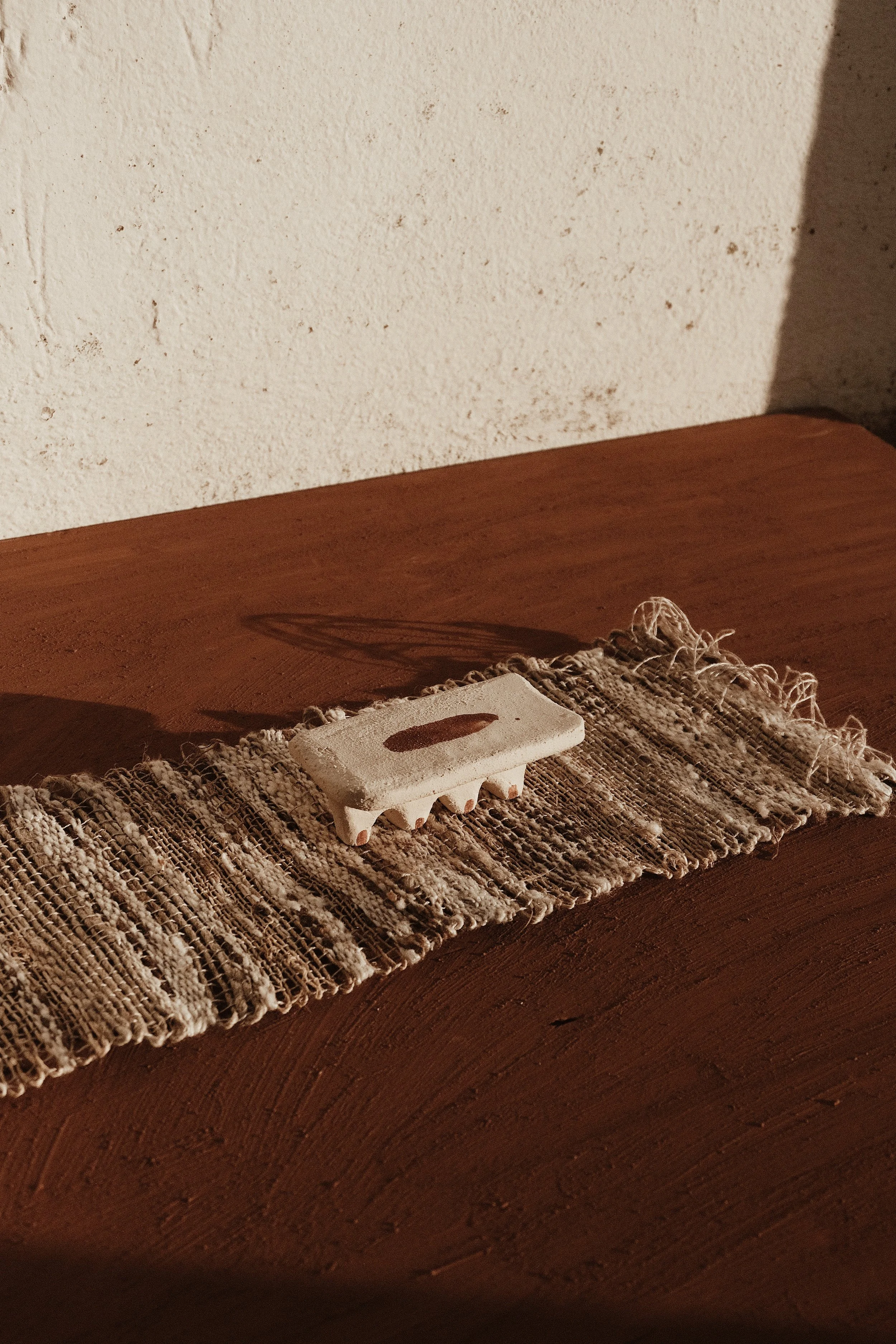 What came to life is a collection of altar sets, each unique as its own magical way to create sacred space. Every set includes a ritual mat that is textured and sensorial, made of ancient materials such as wild silks, nettle, hemp and raw linen, handwoven by Jessica. To which is added a clay altar piece inspired by ancient talismans, that I have hand sculpted and adorned with markings of cretan red Earth.
