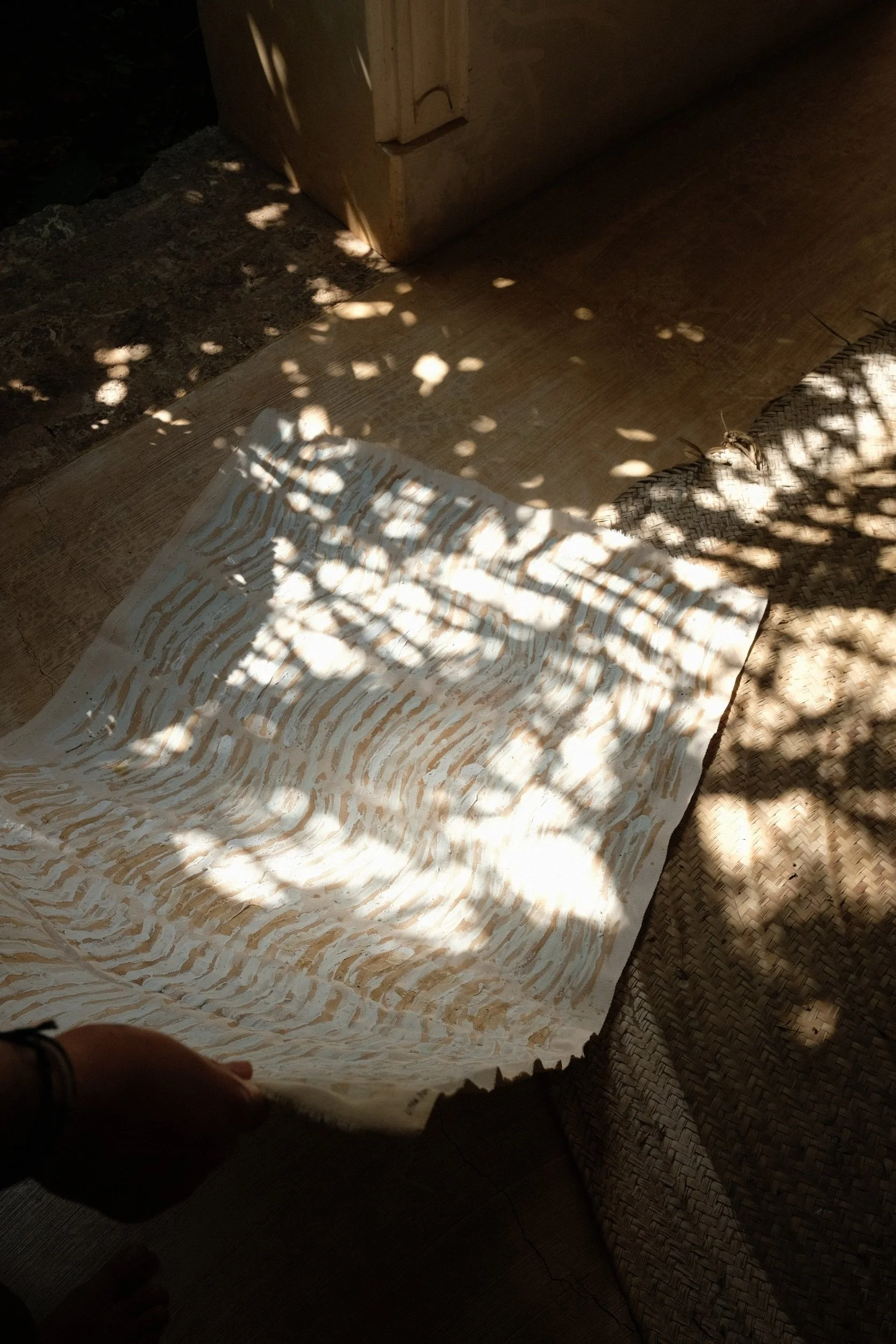 A durable cotton fabric, traditionally used for sailboats, would act as the surface. Black kenyan tea (which the locals prefer to coffee) would become a staining ink. The natural lime plaster, ever present through the island’s architecture, was applied for its expressive texture.